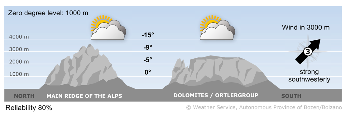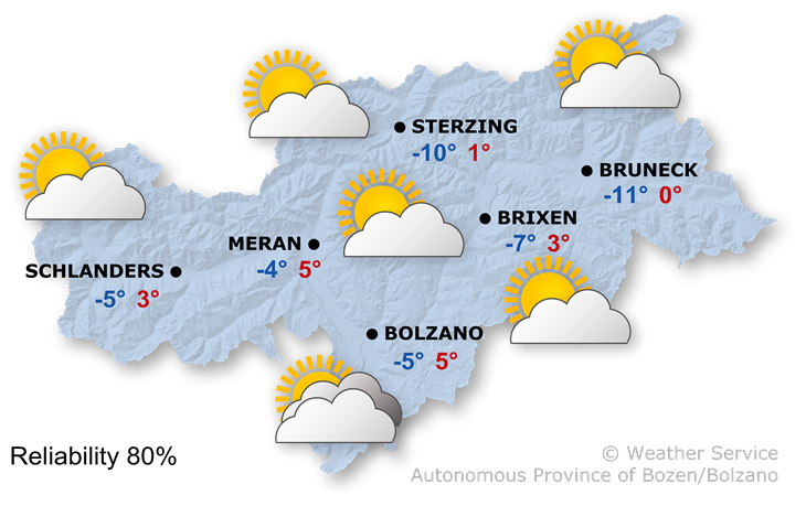 Initially, there will be a mix of sun and clouds, with cloud cover increasing in the afternoon. Light snowfall will set in overnight in some areas, especially between Unterland and Sarntal.