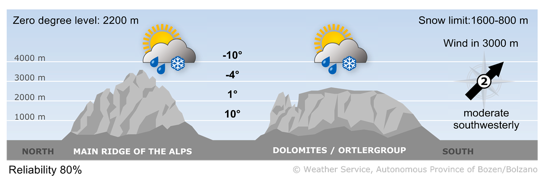 The morning will be mainly sunny. Cloud cover will increase as the day goes on, and widespread showers are expected in the evening. The snow line will drop from 1,600 m to below 1,000 m overnight. North winds will intensify.