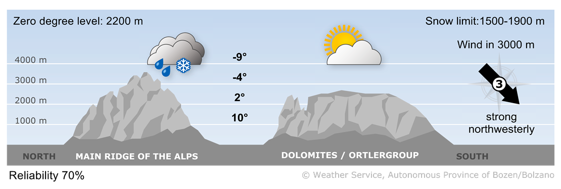 North-westerly currents will persist at high altitudes in the Alps. The Föhn will continue to blow on the southern side.