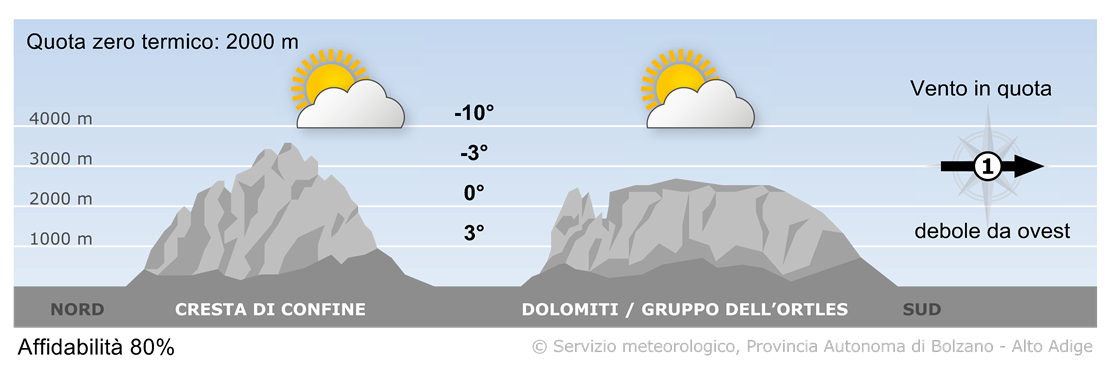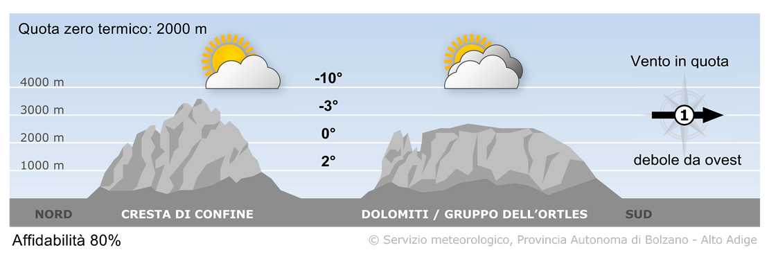 Venerdì in cielo prevarranno le nubi con solo sprazzi di sole. In serata, nelle zone esposte allo stau da sud, saranno possibili le prime deboli precipitazioni.