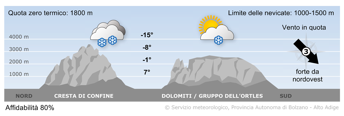 Sulla cresta di confine prevarranno le nubi, verso sud inizialmente ci saranno tratti soleggiati. Nel pomeriggio a nord inizieranno le precipitazioni, nevose oltre 1200-1400 m. A tratti i fenomeni potranno estendersi anche più a sud, soprattutto sulla Val Pusteria e sulle Dolomiti. In Val Venosta soffierà ancora il Föhn.