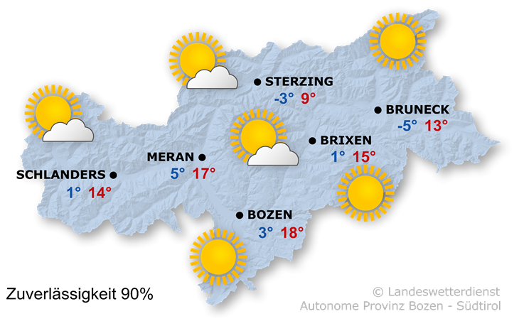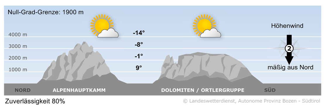 In Südtirol scheint verbreitet die Sonne, der Himmel ist oft ungetrübt. Erst gegen Abend nimmt die Bewölkung zu. Der Nordwind lässt vorübergehend etwas nach.