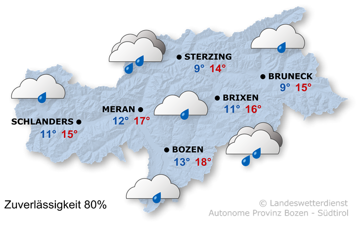 Tagsüber steigen die Temperaturen auf 13° im Wipptal und Pustertal bis 19° im Etschtal und Unterland.