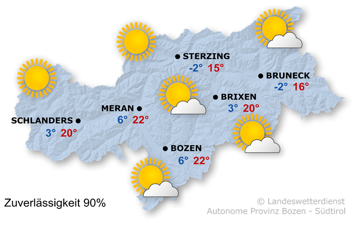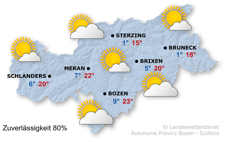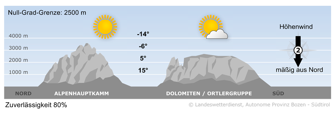 In Südtirol scheint häufig die Sonne. Im Tagesverlauf entstehen einige Quellwolken und vor allem entlang der Grenze zu Nordtirol und in den Dolomiten sind daraus einzelne Schauer möglich.