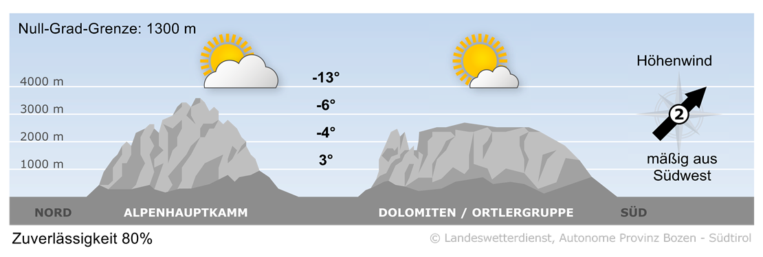 Es bleibt kalt, die Temperaturen reichen von 1° im oberen Pustertal bis 7° im Etschtal.