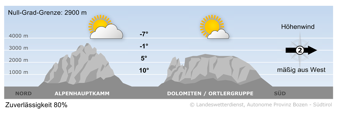 Der Tag verläuft wechselnd bewölkt. Längere sonnige Abschnitte gibt es voraussichtlich Richtung Westen, mehr Wolken in den Dolomiten. Im oberen Pustertal frischt Ostwind auf.