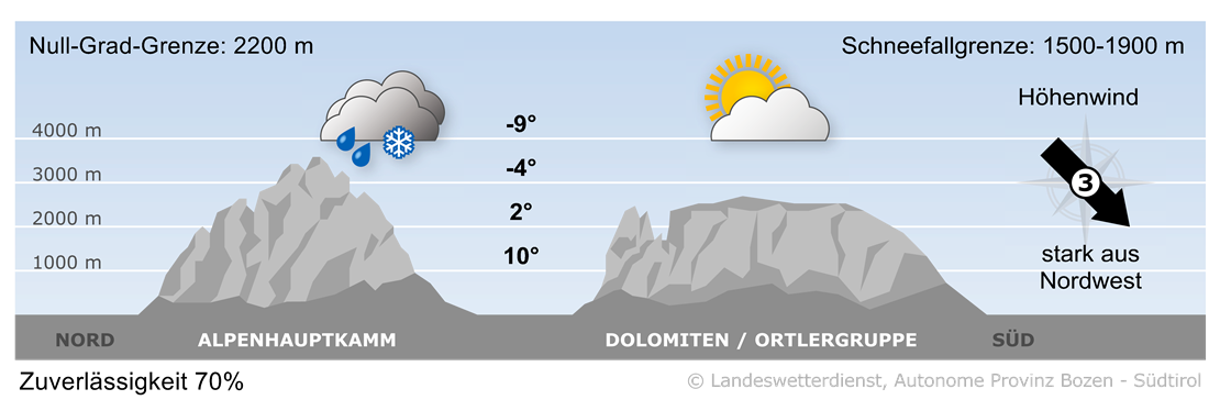 Der Tag verläuft wechselnd bis stark bewölkt. Ganz im Norden, vom oberen Vinschgau über das Wipptal bis ins Pustertal, regnet es etwas, am meisten im hinteren Ahrntal. Die Schneefallgrenze steigt im Laufe des Tages auf über 1800 m. In den südlichsten Landesteilen ist es freundlicher und zeitweise sonnig.