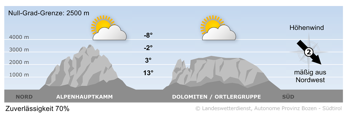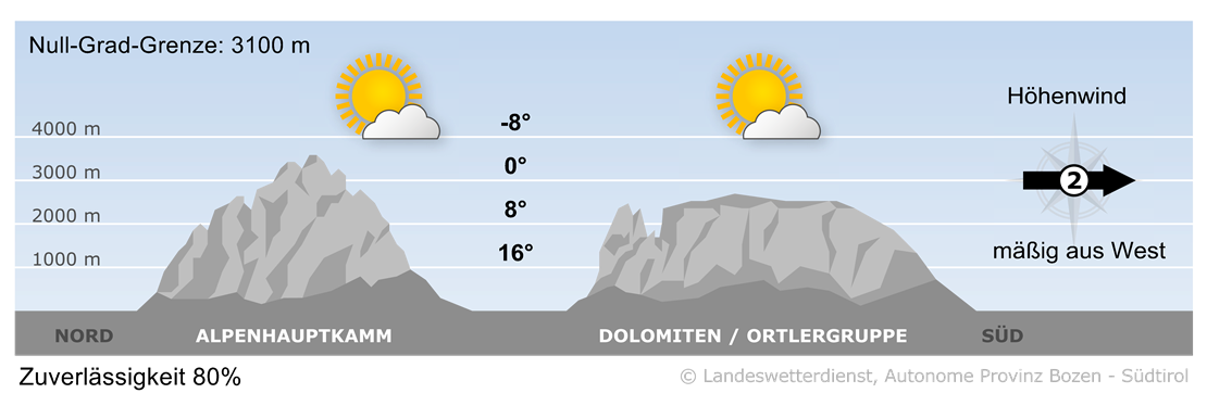 Sonne und Wolken wechseln, die dichtesten Wolken gibt es am Vormittag und zwar im Norden Südtirols. Richtung Süden überwiegt der Sonnenschein. Der Nordföhn flaut ab.