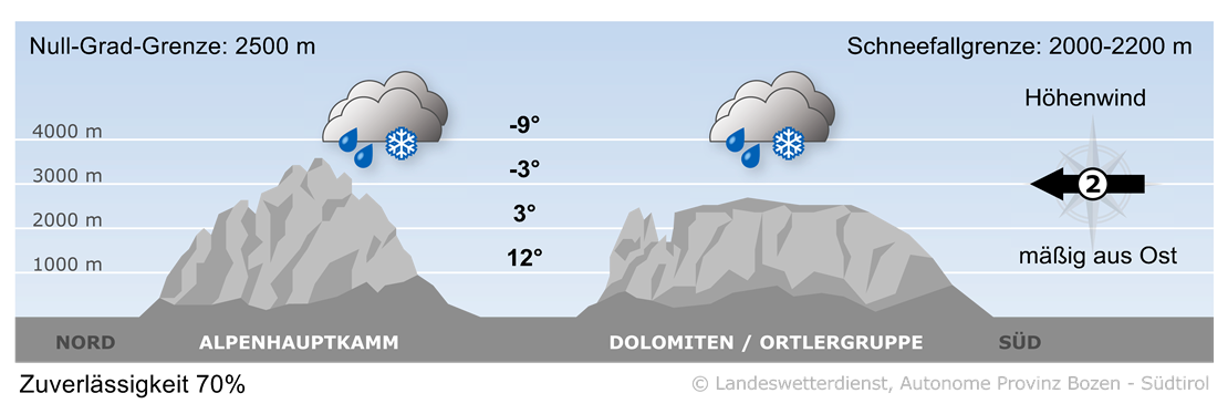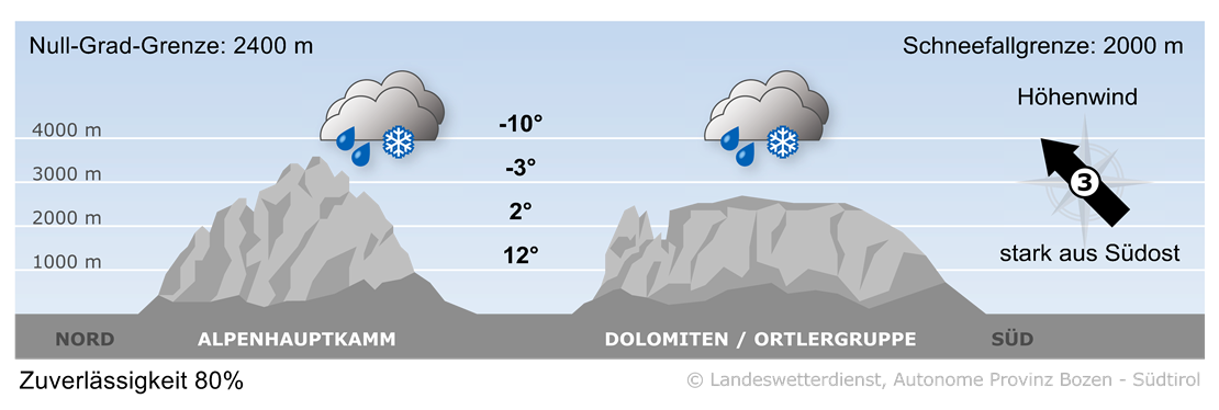 Ein Tief über Italien steuert von Südosten her sehr feuchte Luft nach Südtirol.