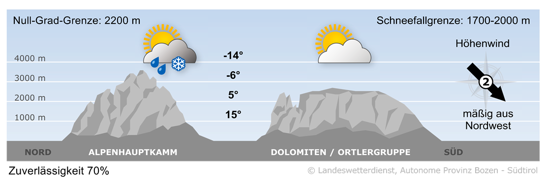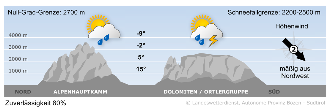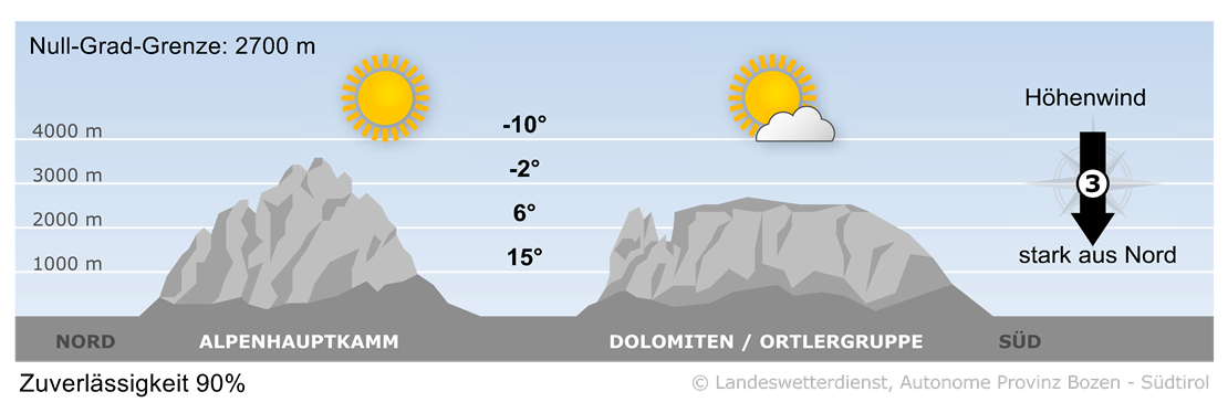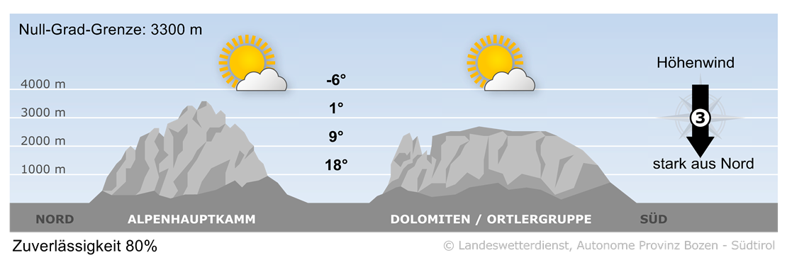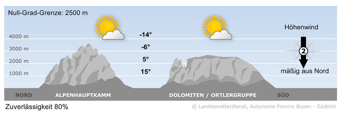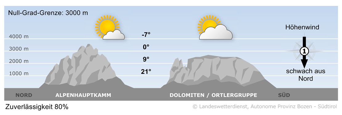 Am Samstag, dem Feiertag, bleibt es sonnig mit nur wenigen Schleierwolken. Nach wie vor ist es in den nördlichen Tälern föhnig und im Süden frühsommerlich warm mit bis zu 27°.