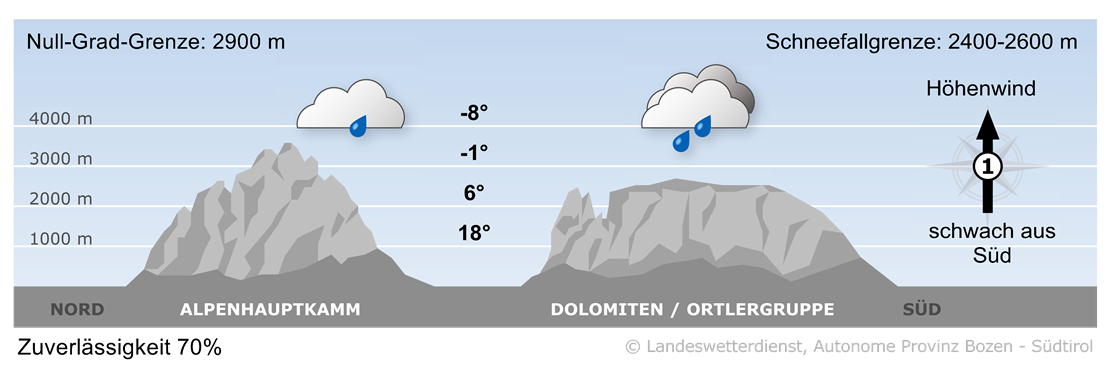 Am Vormittag ist es oft sonnig. Bis zum Nachmittag bilden sich Quellwolken und vor allem in den südlichen Gebirgsgruppen sind in der Folge einzelne Regenschauer möglich.