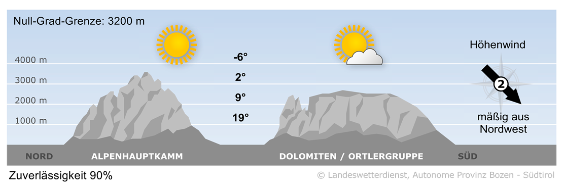 Am morgigen Samstag, dem Feiertag, bleibt es sonnig mit nur wenigen Schleierwolken. Nach wie vor ist es in den nördlichen Tälern föhnig und im Süden frühsommerlich warm mit bis zu 28°.